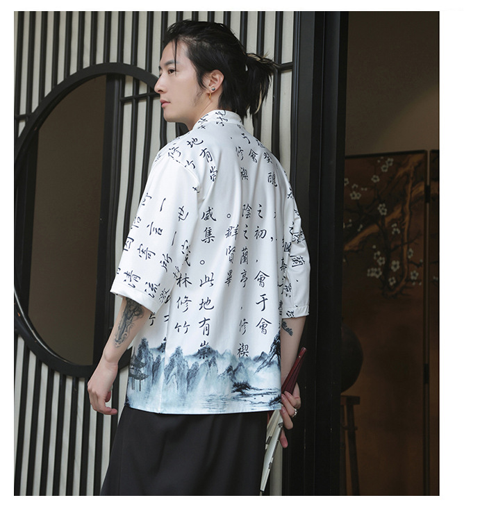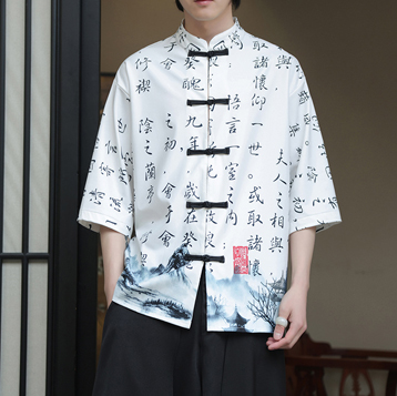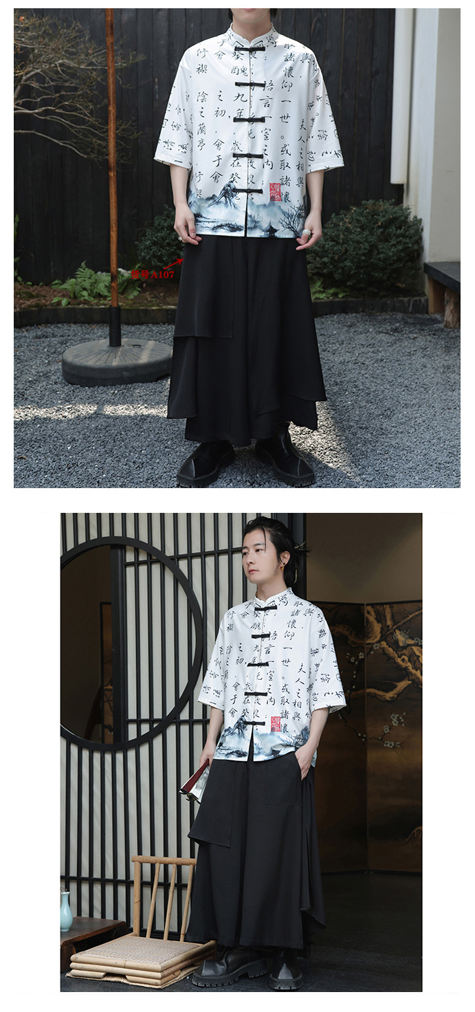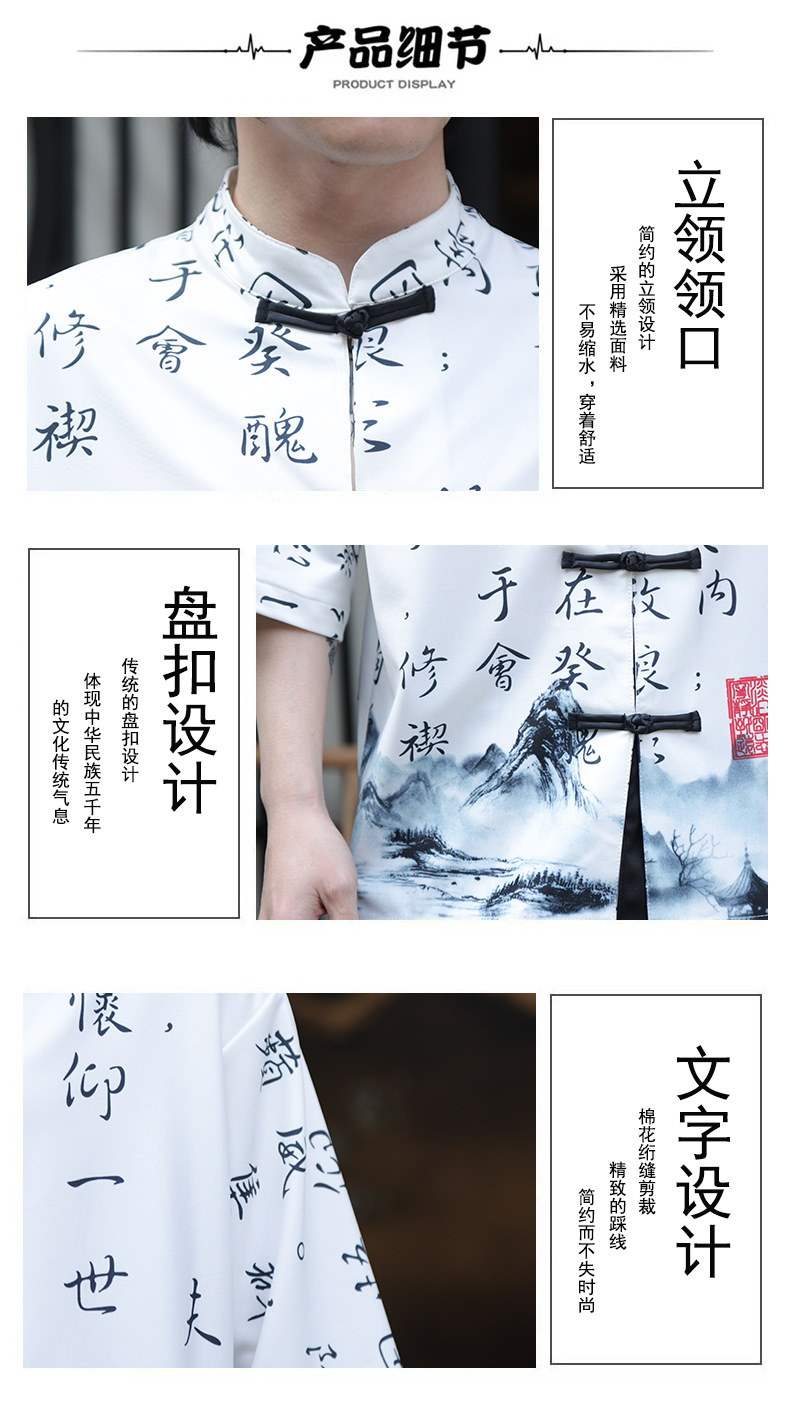 新中式书法满印花古风短袖衬衫男复古宽松中国风夏季盘扣衬衣男装,此时尚书法艺术装,包邮!