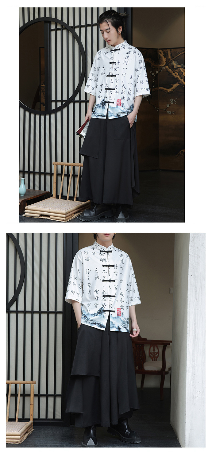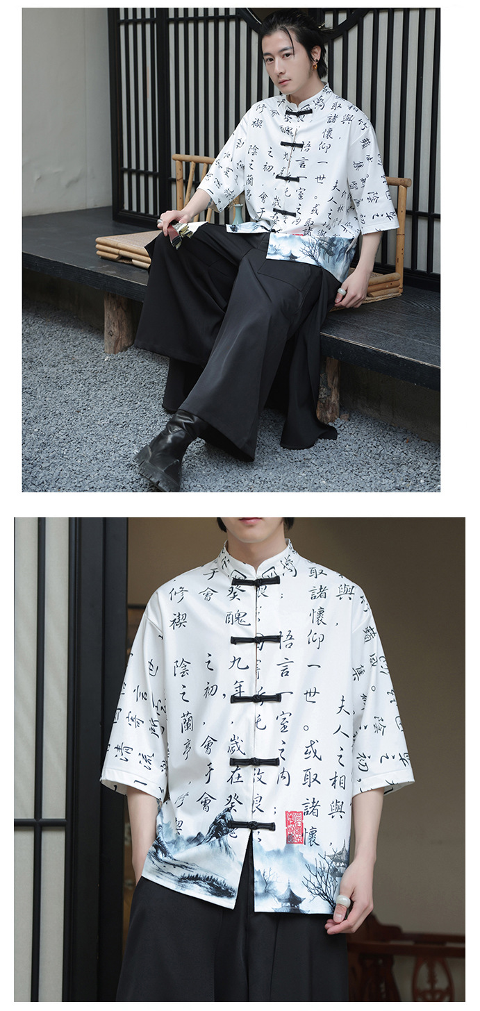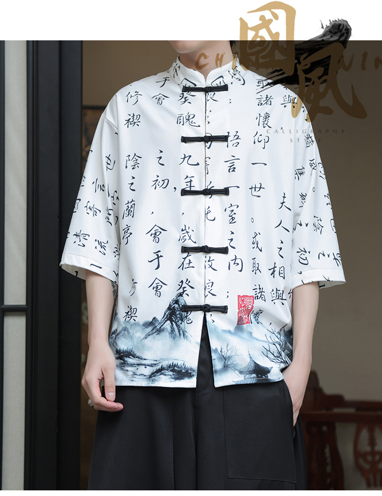 新中式书法满印花古风短袖衬衫男复古宽松中国风夏季盘扣衬衣男装